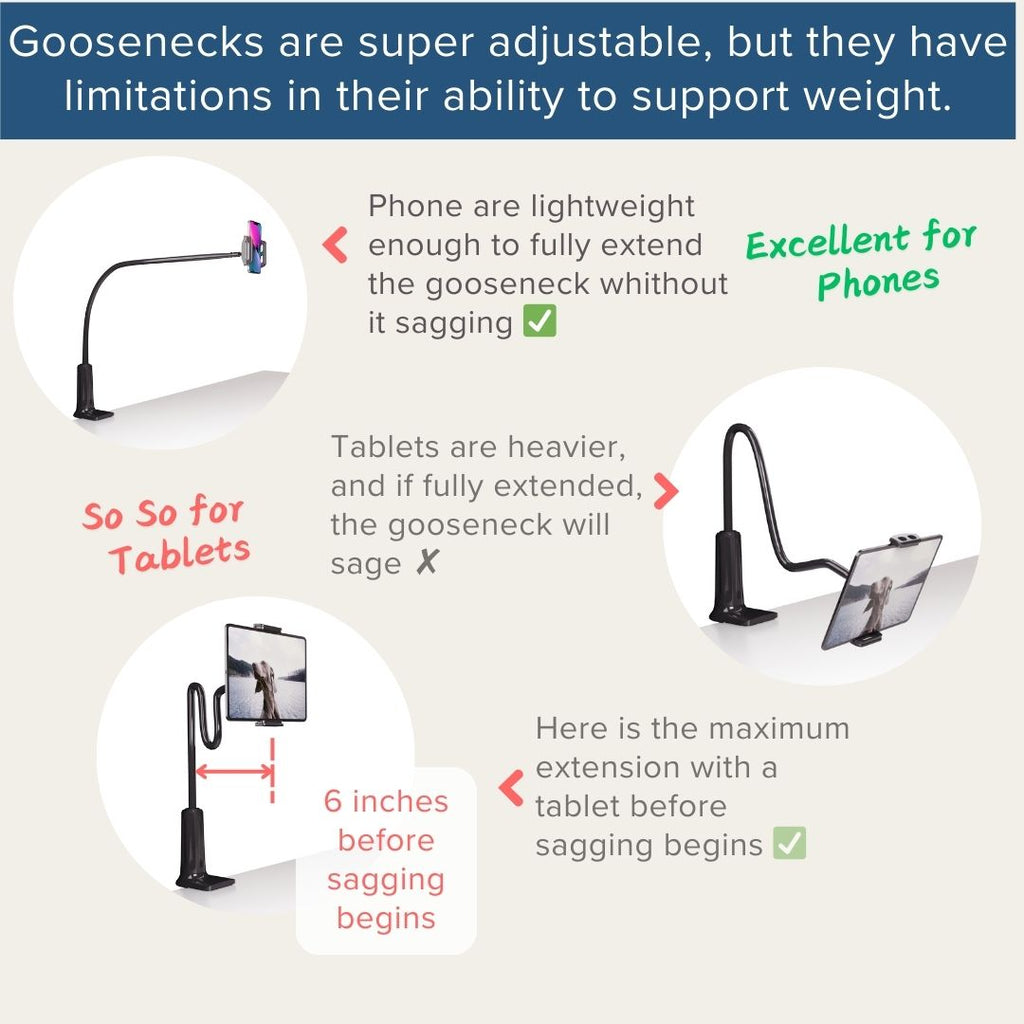 Goosenecks of this type commonly provide excellent support for phones. However, for heavier devices like tablets, they tend to sag when extended beyond 6 inches due to the added weight.