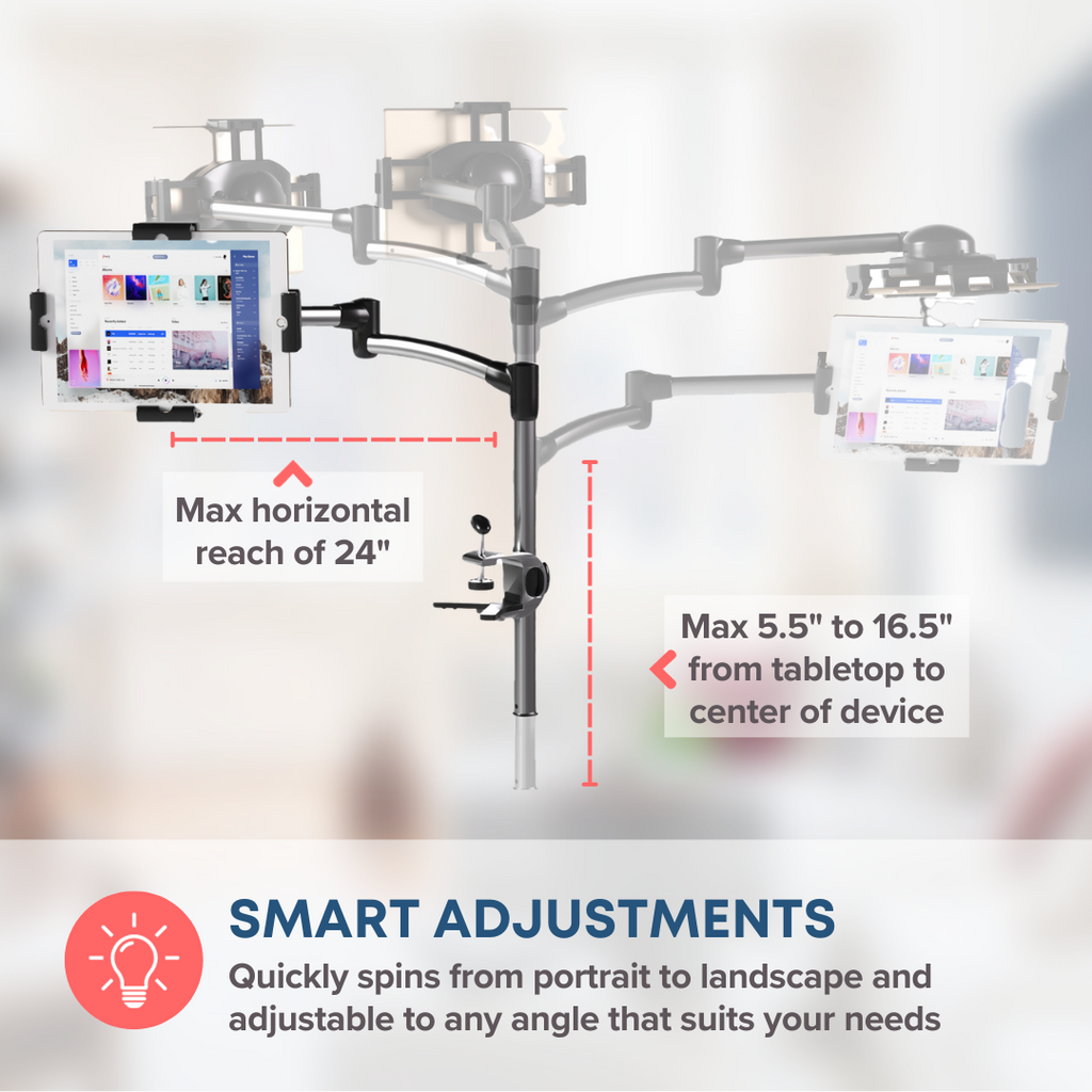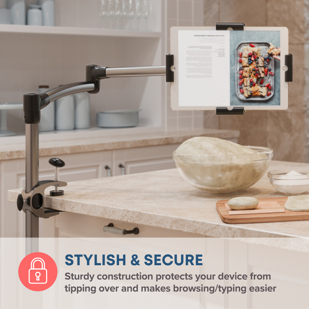Easily clamps to a nearby table, allowing you to surf from your favorite chair, follow a recipe from the kitchen, work at your desk, or watch a video from bed! The 5-axis articulation swing-arm allows you to position your device any way you want and fold it away when you are finished.