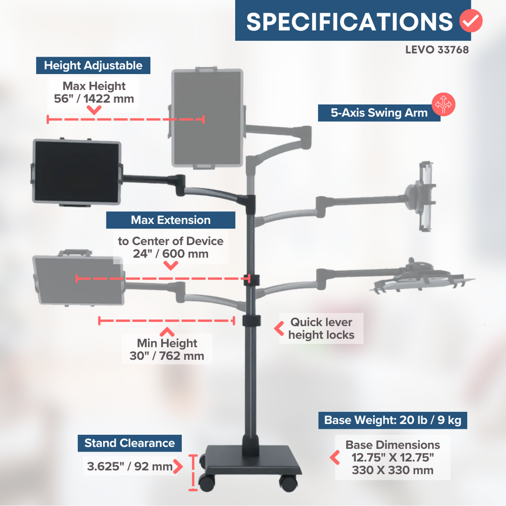 This LEVO is loaded with features, like our quick lever height adjustment locks, a 5-axis articulating swing arm for quick positioning, a 4-sided tablet cradle with quick release, a heavy-duty structure, a lustrous anodized aluminum finish, and locking casters.