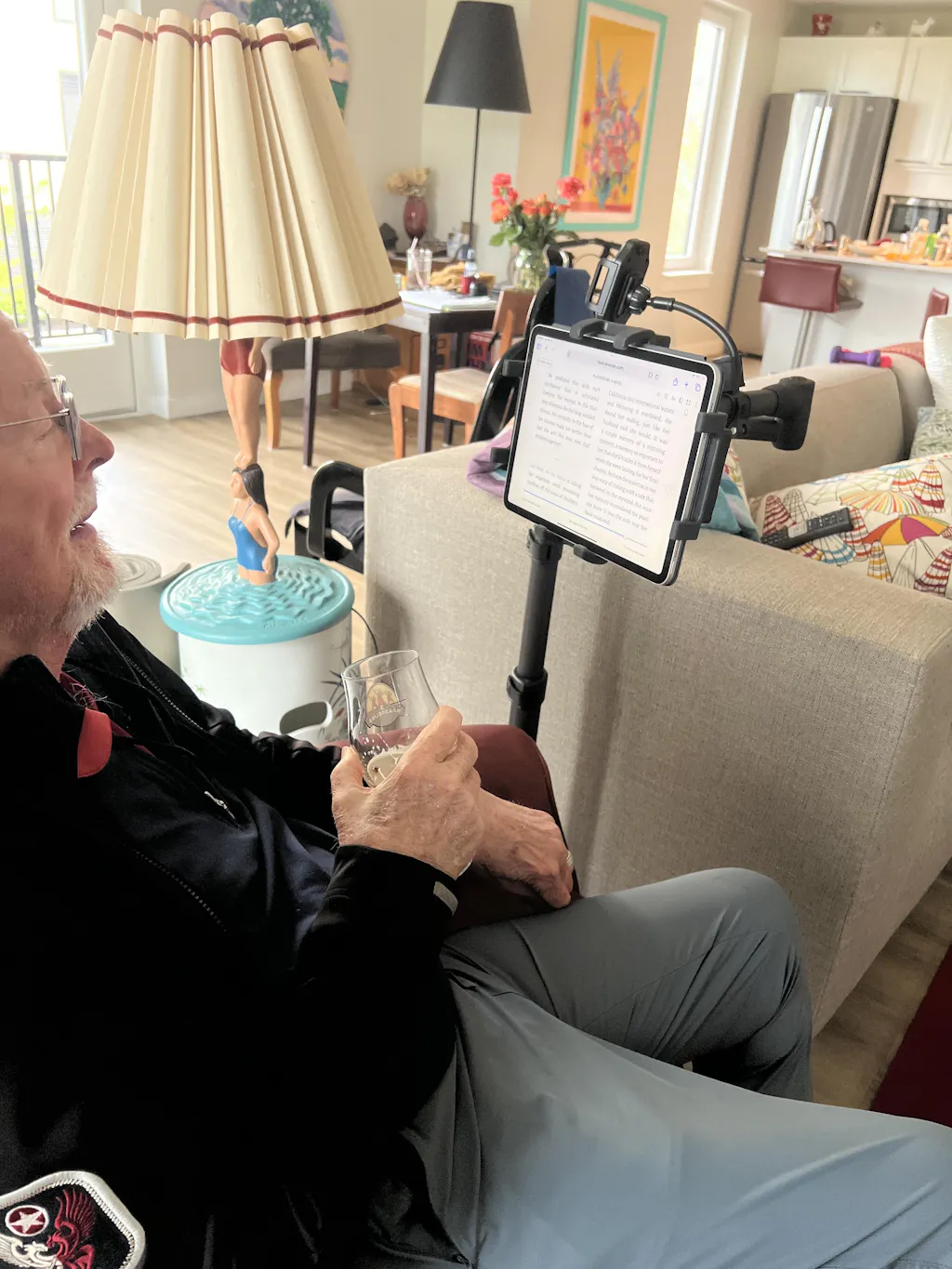 The primary benefit of this LEVO stand is its long 24 inch horizontal arm with a cantilever design. It allows your tablet to extend over your furniture without requiring clearance underneath. To achieve this, the base weighs 20 pounds to act as a counterweight, making the stand sturdy and reliable.